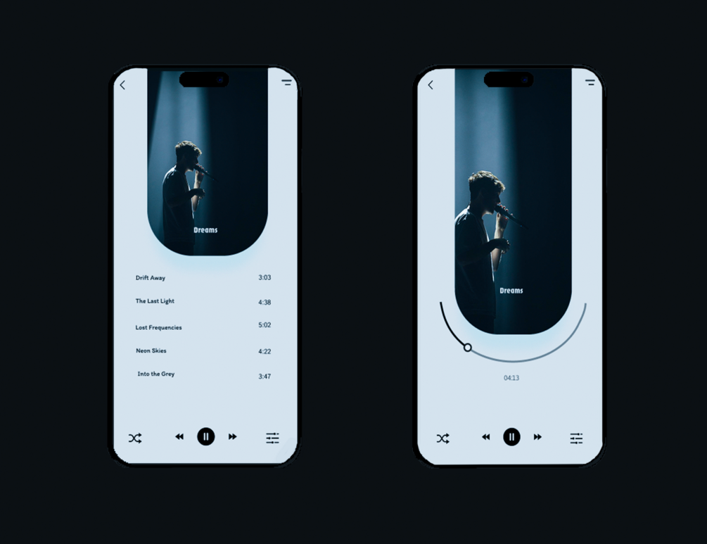 DreamWave is a minimal, premium music player UI designed with smooth curves, clean typography, and a soft aesthetic that fits modern audio apps perfectly.